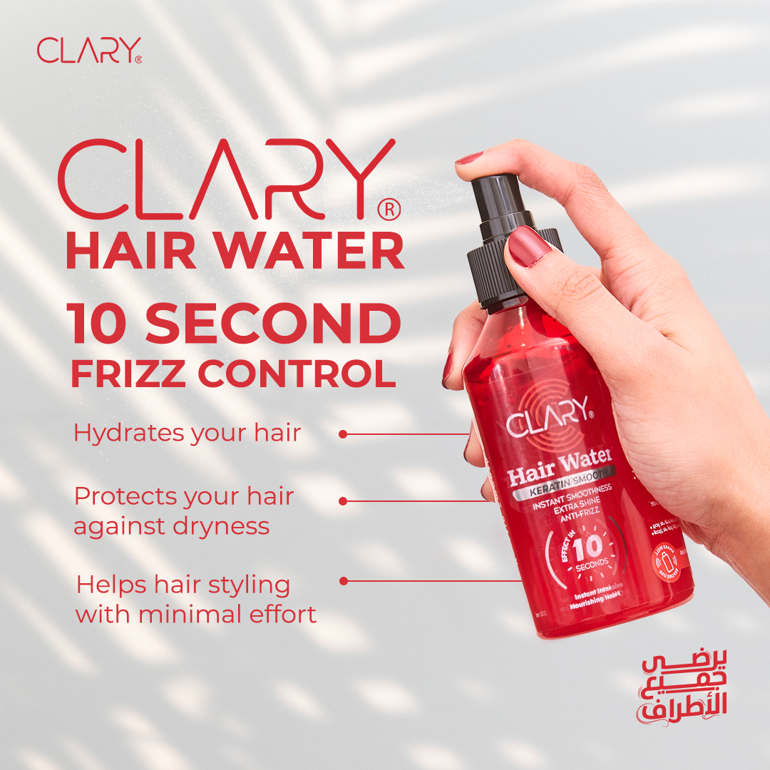 ماء شعر كلاري 200 مل — رذاذ خفيف الوزن ومرطب ينعش الشعر، يقلل من التجاعيد، ويعزز اللمعان الطبيعي. يغذي ويجدد الخصلات دون أن يثقلها، مما يجعل الشعر ناعماً، سلساً، وسهل التصفيف.