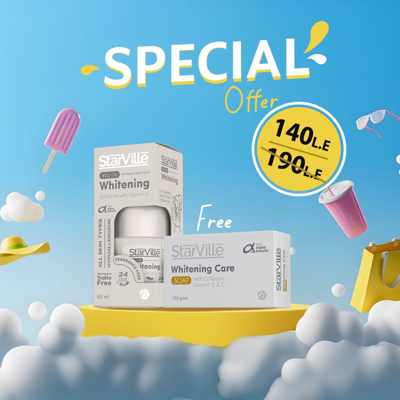مزيل عرق ستارفيل المُبيض رول أون 60 مل + صابون ستارفيل المُبيض للعناية 90 غرامًا يُقدمان روتينًا متكاملًا لتفتيح البشرة وانتعاشها. يُنظف الصابون البشرة بلطف ويُوحد لونها، بينما يُبيض مزيل العرق منطقة تحت الإبطين، ويُسيطر على الرائحة، ويُحافظ على نعومة البشرة طوال اليوم.