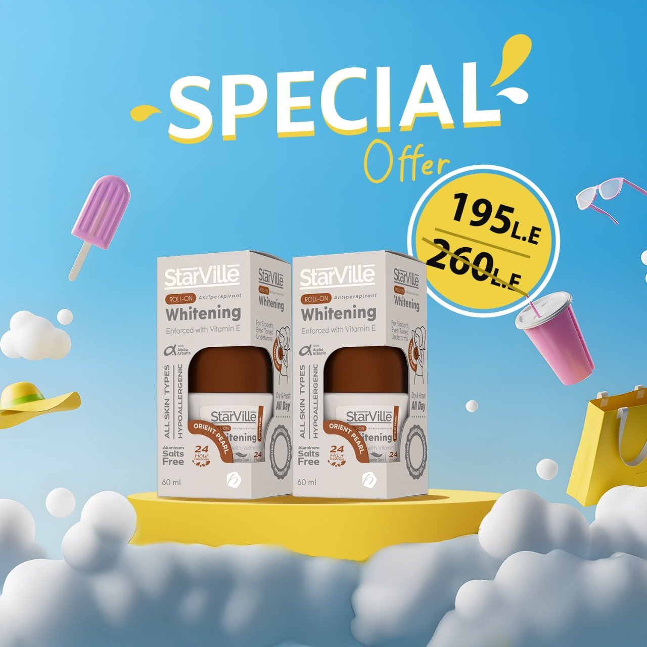 مزيل عرق ستارفيل المُبيض بجوز الهند، 60 مل، عبوة من 1+1، يُفتّح بشرة الإبطين بلطف، مع انتعاش يدوم طوال اليوم، وتحكم في الرائحة. غني بمستخلص جوز الهند، يُهدئ البشرة ويُغذيها، ويتركها ناعمة وملساء، وموحدة اللون.