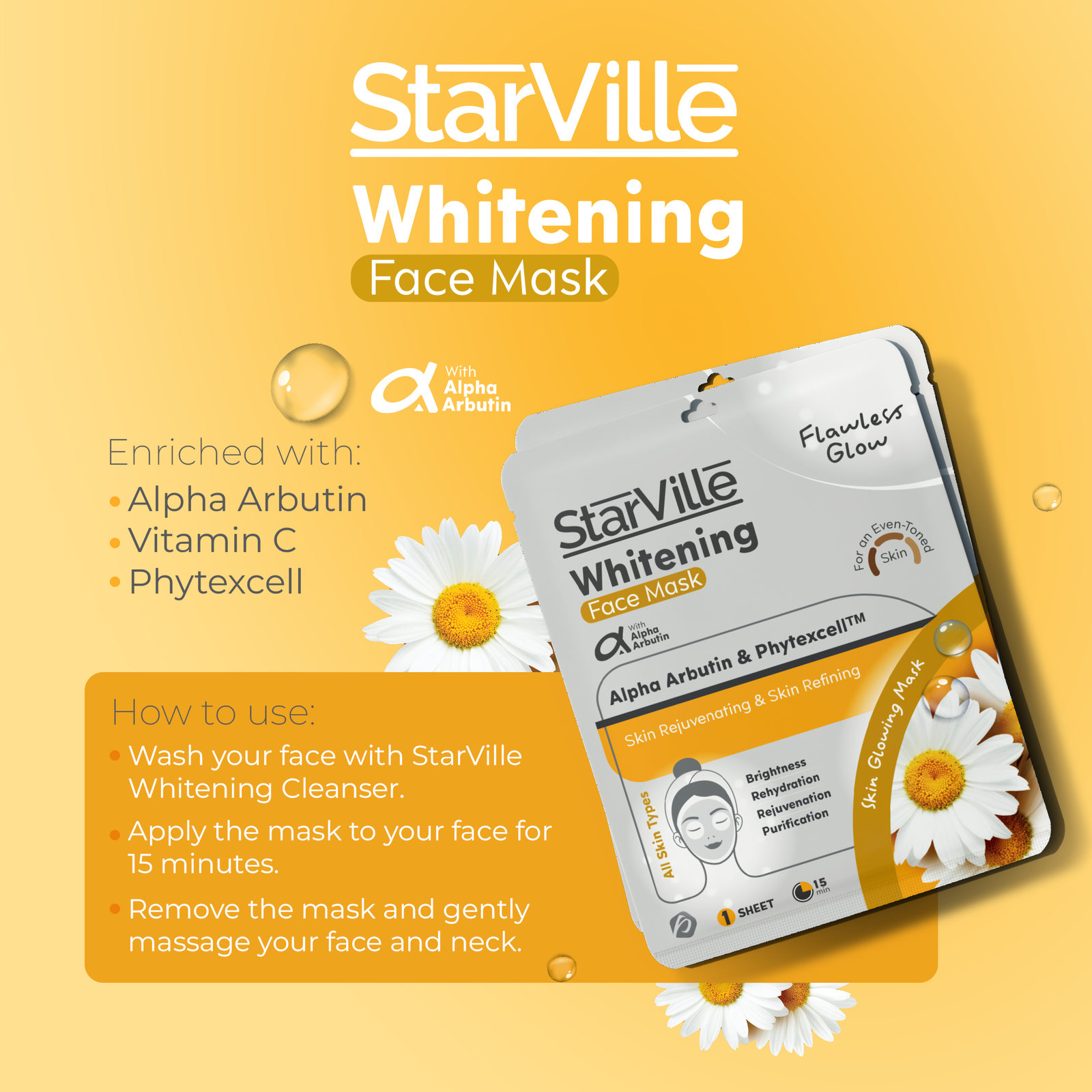 Starville Whitening Face Mask 10 Sheets is designed to brighten, hydrate, and refresh your skin. Infused with active whitening ingredients, it helps improve skin tone, leaving your face radiant and smooth.