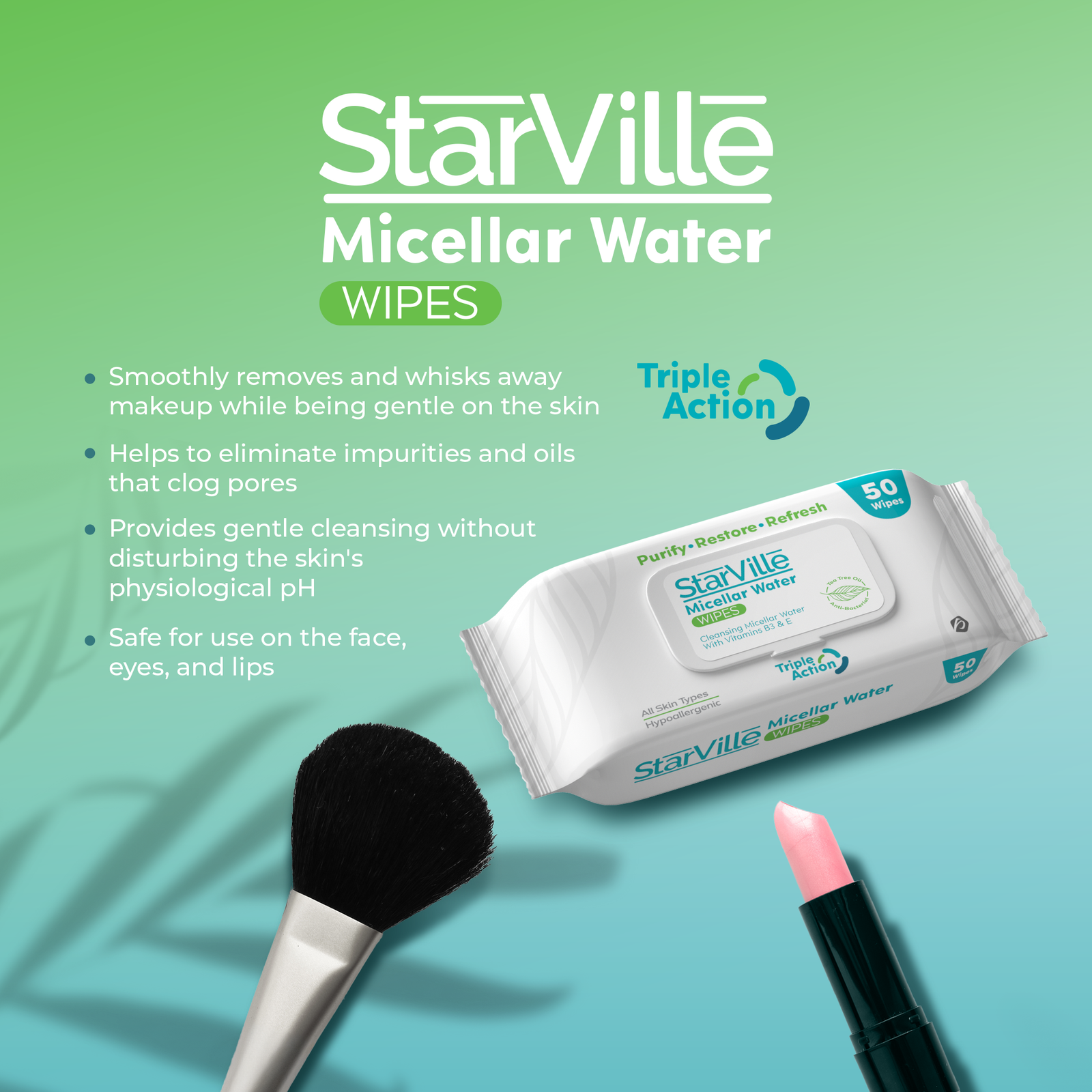 Starville Micellar Water Wipes are gentle cleansing wipes designed to remove makeup, dirt, and impurities while refreshing and hydrating the skin, leaving it clean, soft, and balanced.